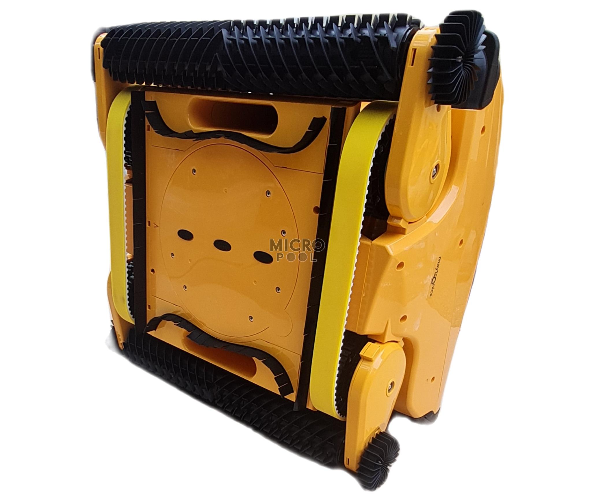 Vedere din partea inferioara a luii Dolphin Wave 150, cu porturile de aspiratie, periile spiralate si trenul de rulare.