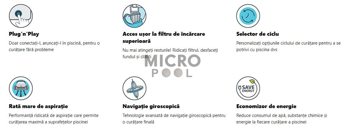 - Peria unică în formă de spirală colectează de pe ambele părți laterale ale robotului impuritățile, către centrul punctului de absorbție, in timp ce periile laterale curăță colțurile de la joncțiunea pardoselii bazinului cu pereții laterali.
