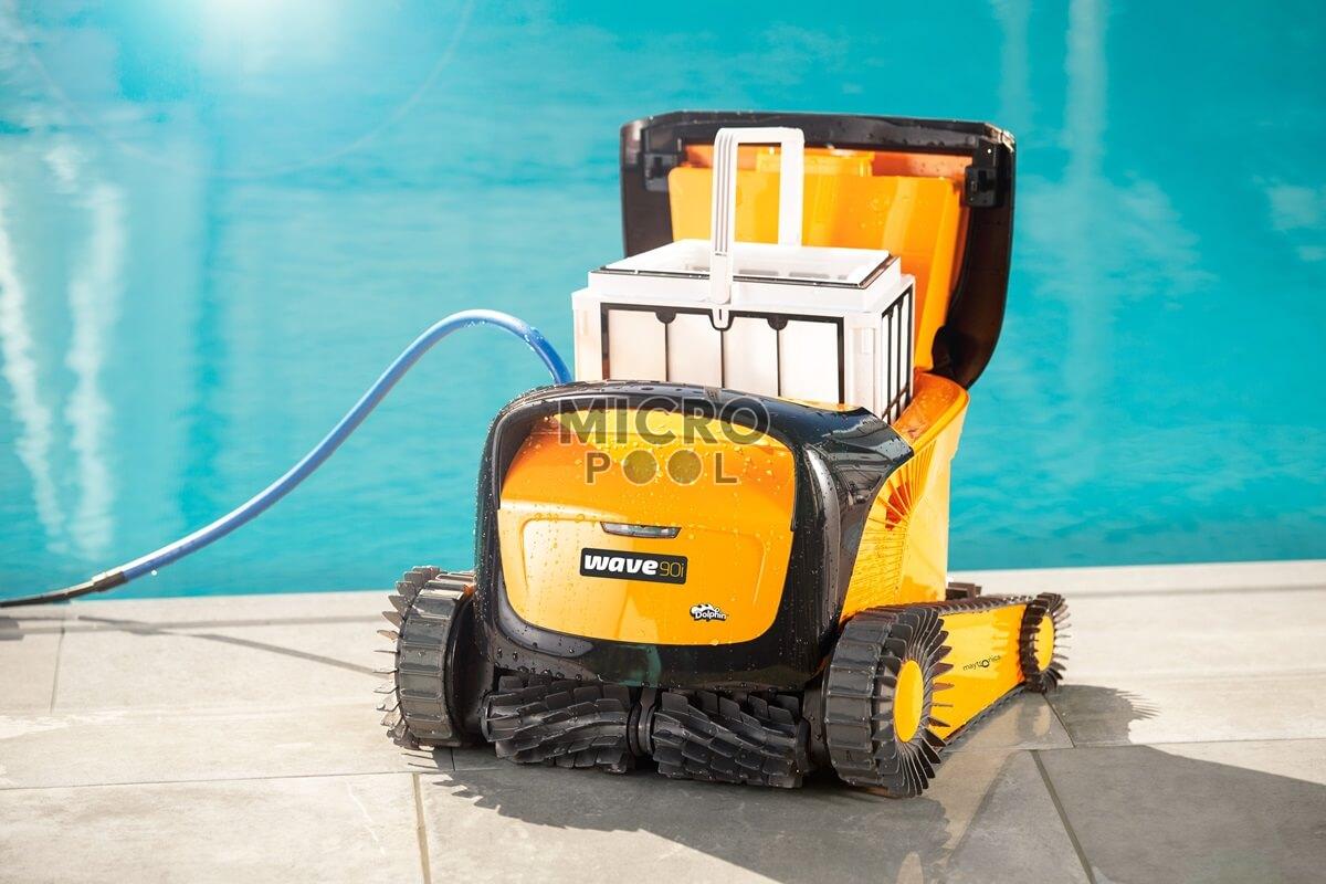 Solutia ideala pentru piscine publice de maxim 20 de metri, robotul Dolphin WAVE 90i Maytronics.