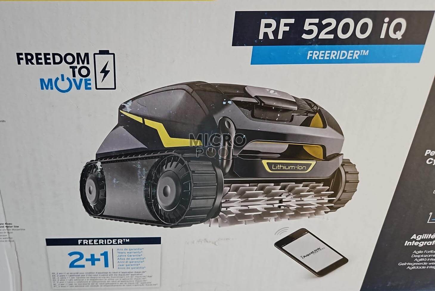 Robot aspirator de curățat piscine Zodiac Freerider RF 5400 iQ cu aplicatie mobila iAqualink® prin intermediul careia se poate verifica instant statusul bateriei robotului, notificari si actalizari, precum si alegerea modului de curatare SMART.